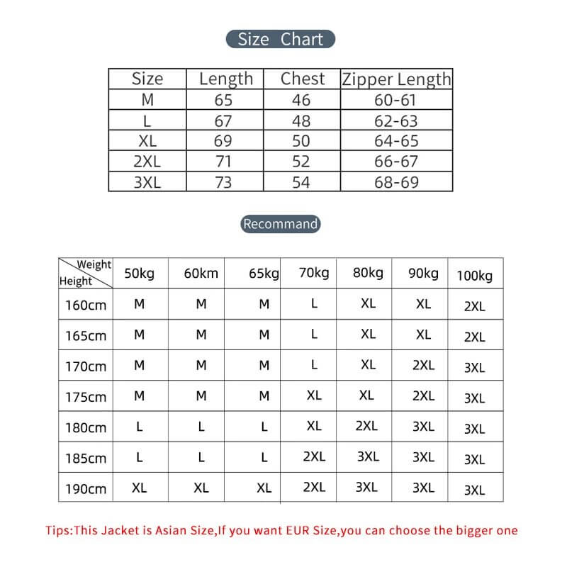 Tips: This Jacket is Asian Size, If you are EUR Size, You can choose the bigger one